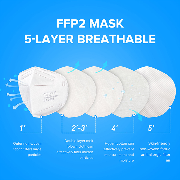 Non-woven outer layer + filter paper layer + skin-friendly non-woven inner layer. Breathable and comfortable, low breathing resistance.